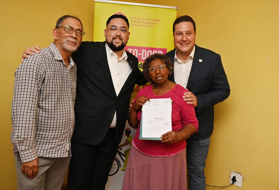 Mayor Geordin Hill-Lewis and Councillor Carl Pophaim, Mayoral Committee Member for Human Settlements, visited the community of Kalkfontein in Kuils River to distribute title deeds to families residing in Council Rental Units as part of the City’s campaign to accelerate title deed delivery. The families were overjoyed to become home owners without the burden of any costs thanks to the City’s innovative No Cost Transfer programme. Read more below: