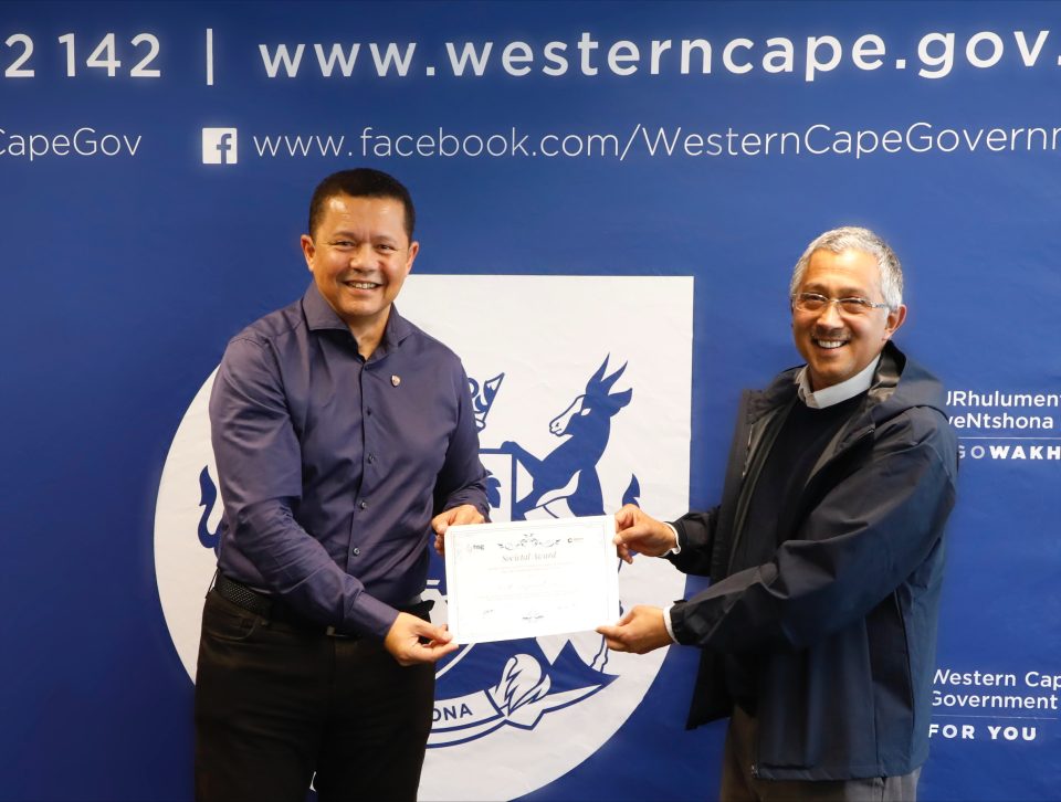 Dr Saadiq Kariem, who accepted the award on Dr Cloete’s behalf, formally handed over the accolade yesterday during a meeting with the department’s senior management in Cape Town.