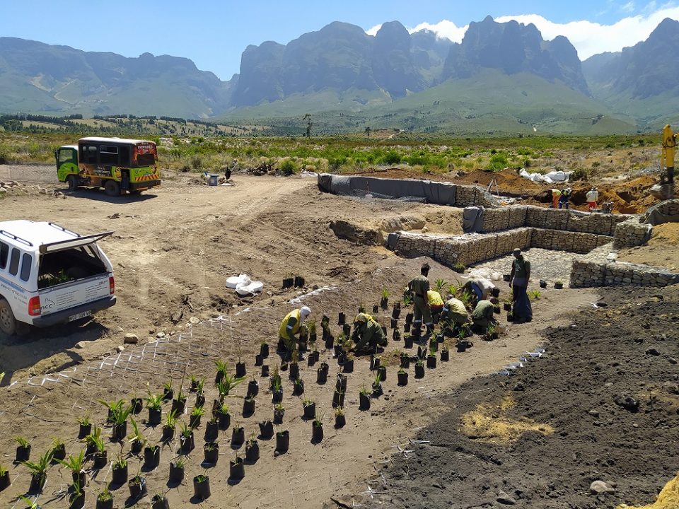As part of the rehabilitation programme, local indigenous vegetation was prepared for replanting after the erosion control weirs had been constructed and other containment measures put into place.